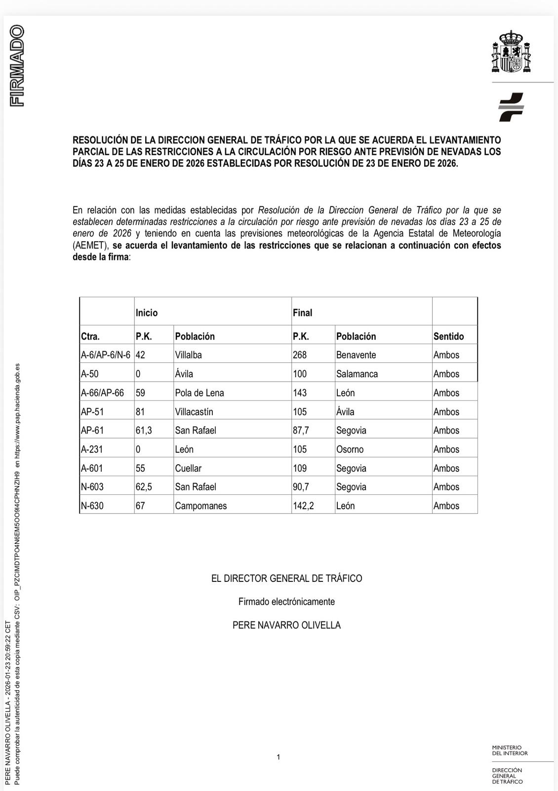 El documento oficial detalla los tramos concretos en los que se suprimen las limitaciones de circulación, en ambos sentidos, tras evaluar el estado de la calzada y la evolución del temporal.